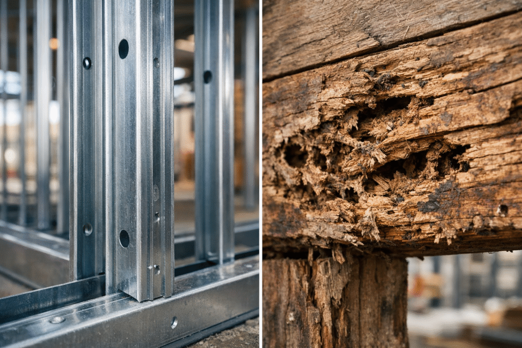Steel framing is not affected by termites or pests like timber, as it does not provide a food source or habitat for infestation. This eliminates a major cause of structural damage, ensuring long-term durability while reducing maintenance costs and the need for chemical treatments over the life of the building.